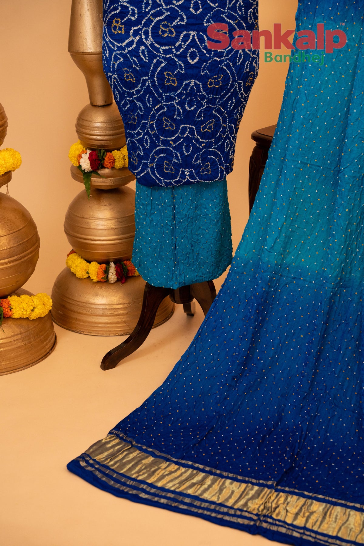 Immerse yourself in heritage with this luxurious Bandhej dress material, crafted from pure Banarasi Gajji Silk. The top features intricate yellow and white rai Bandhej, offering a rich, handcrafted appeal. Paired with a contrasting bottom showcasing classic Bandhej dot work, the ensemble is completed with a striking dual-shaded dupatta adorned in yellow-white Bandhej and finished with elegant lagdi patta on both ends. Perfect for weddings, pujas, and grand festive occasions, this set stands out for its vibrant contrast, traditional detailing, and timeless elegance.