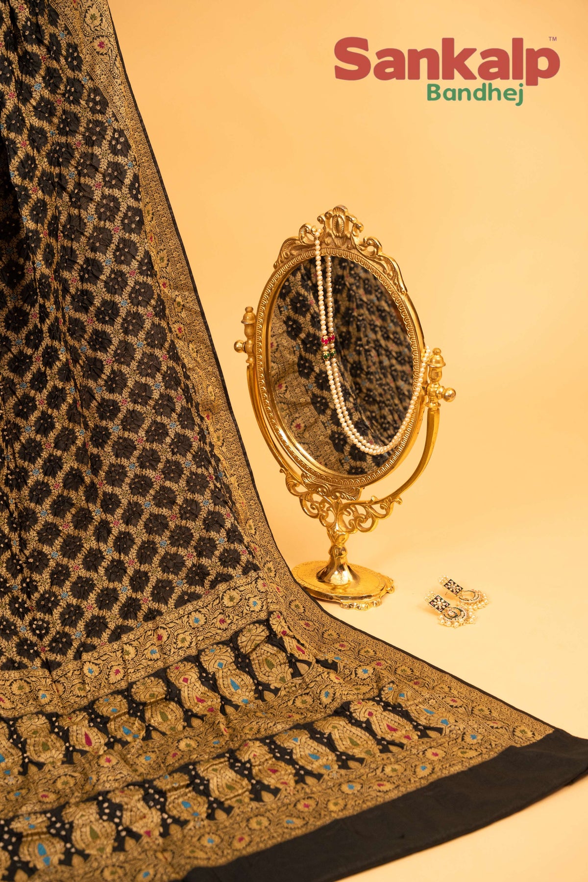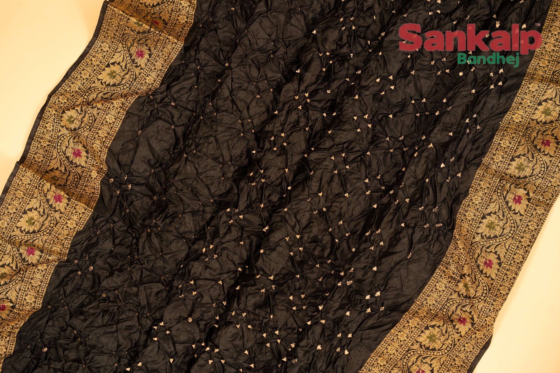 Black Pure Dupion Silk Bandhej Saree With Meena Work