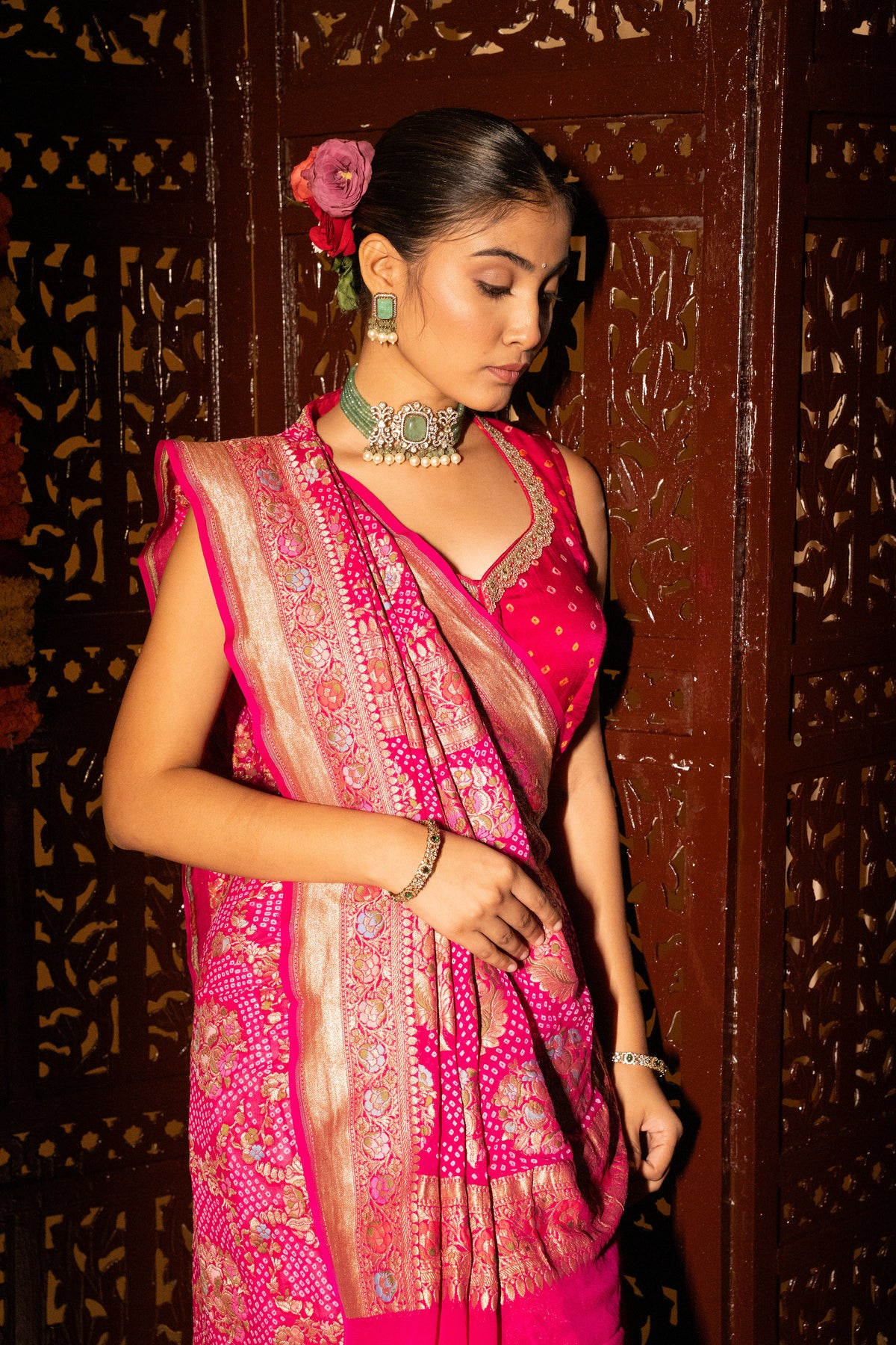 Rani Pink Pure Georgette Silk Meenakari Rai Bandhej Saree