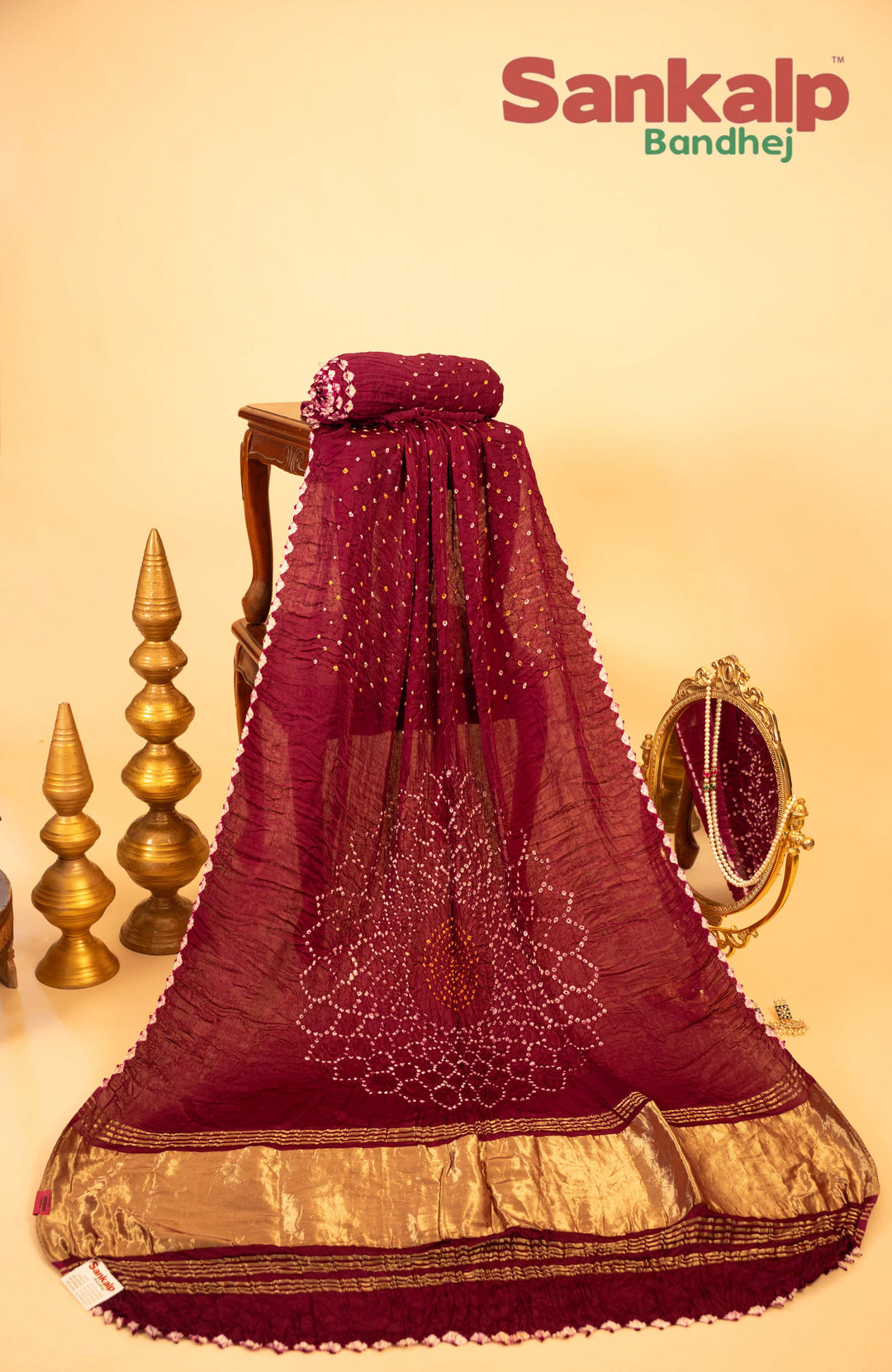 Deep Maroon Pure Modal Silk Bandhani Saree With Lagdi Patta