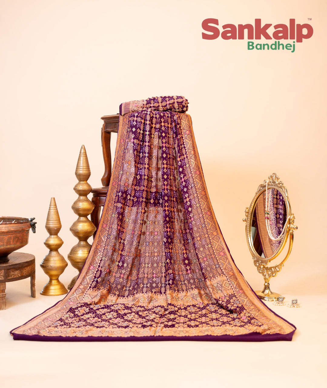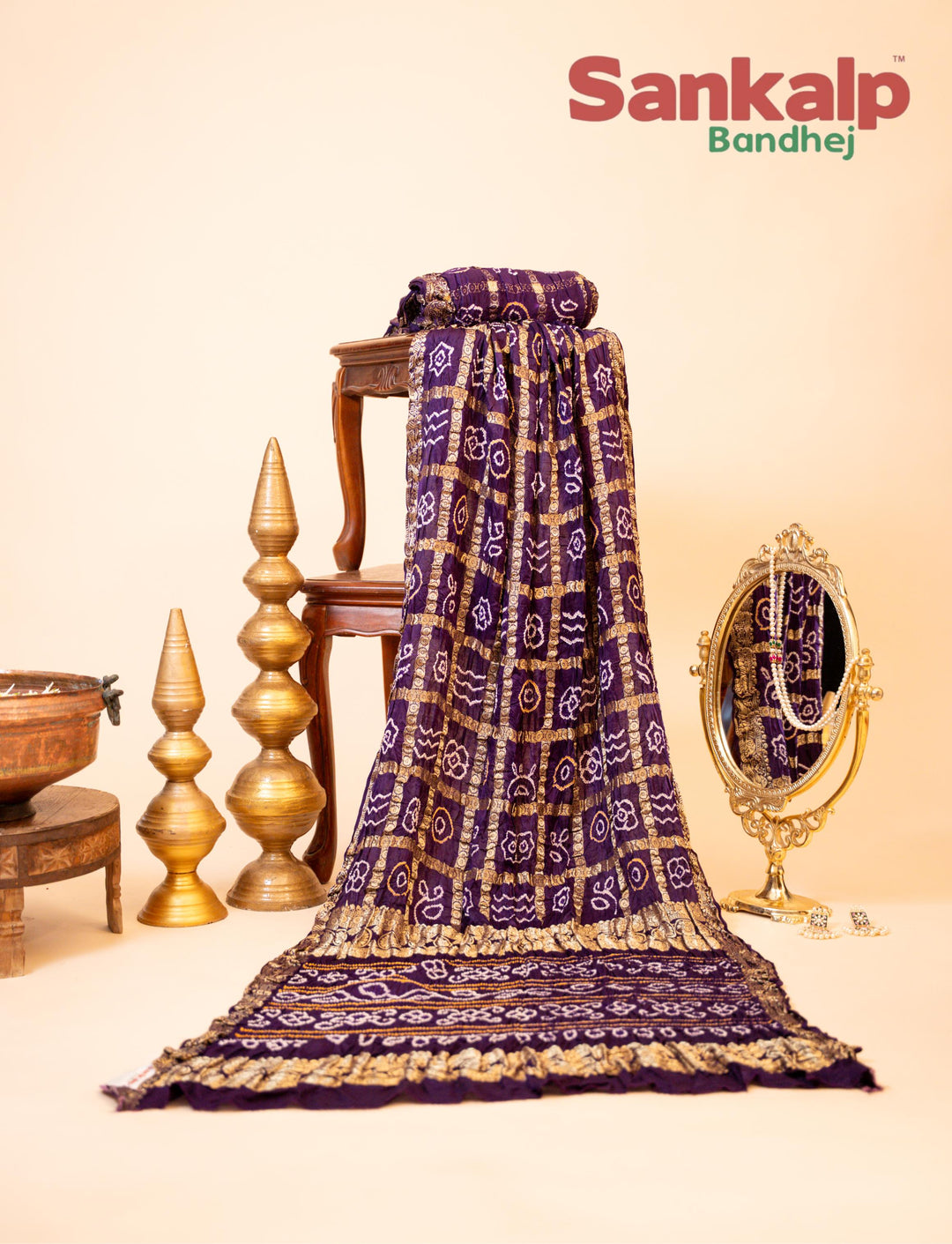 Purple Gajji Gharchola Bandhani Saree With Golden Lagdi Patta