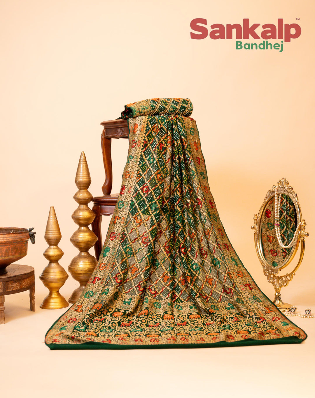 Dark Green Pure Gajji Silk Bandhani Saree With Lagdi Patta Pallav