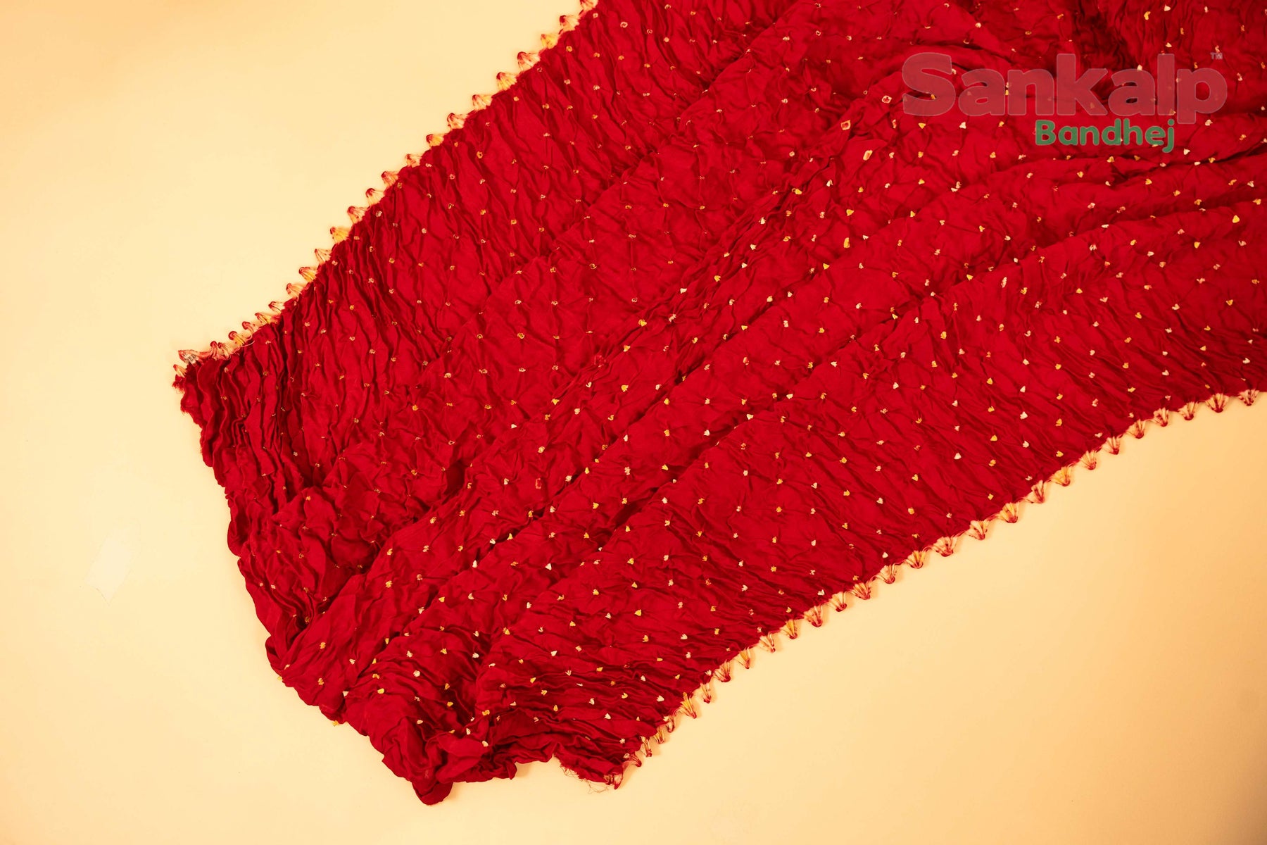 Bright Red Pure Modal Silk Bandhani Saree With Lagdi Patta