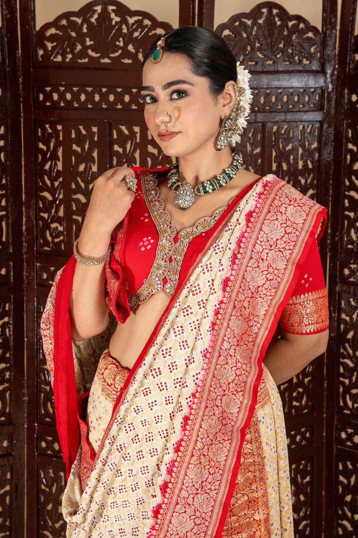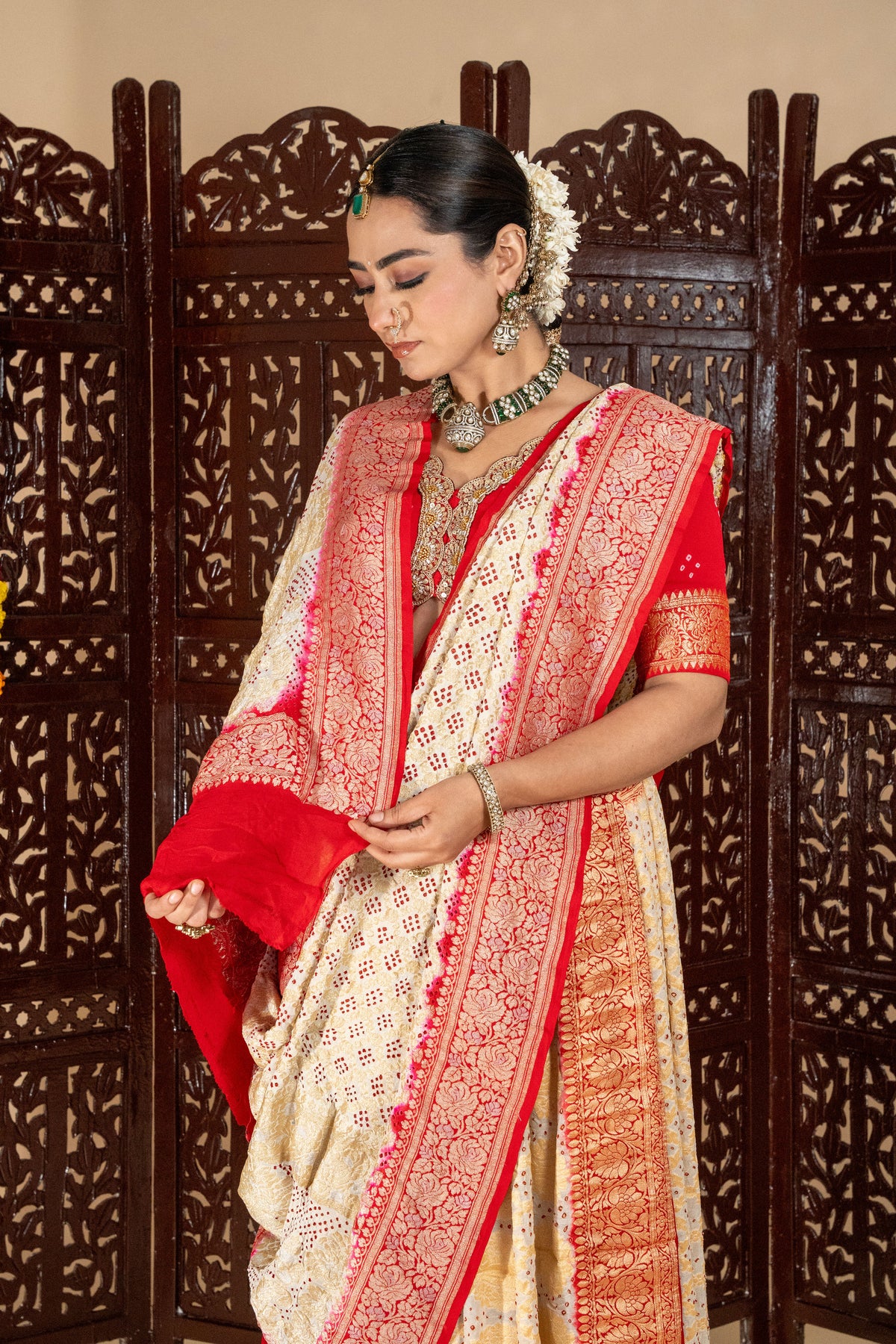 Red & Cream Bandhani Silk Saree with Contrasting Border