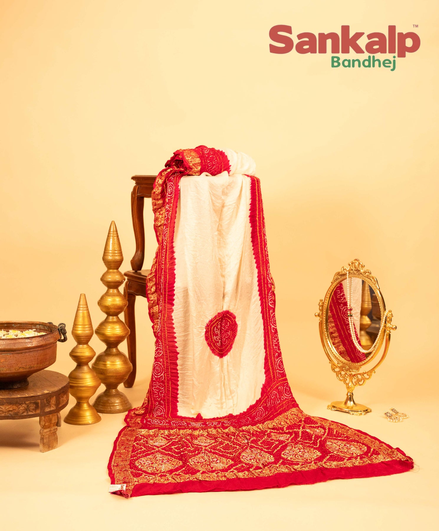Red Pure Gajji Silk Bandhej Saree With Banarasi Border